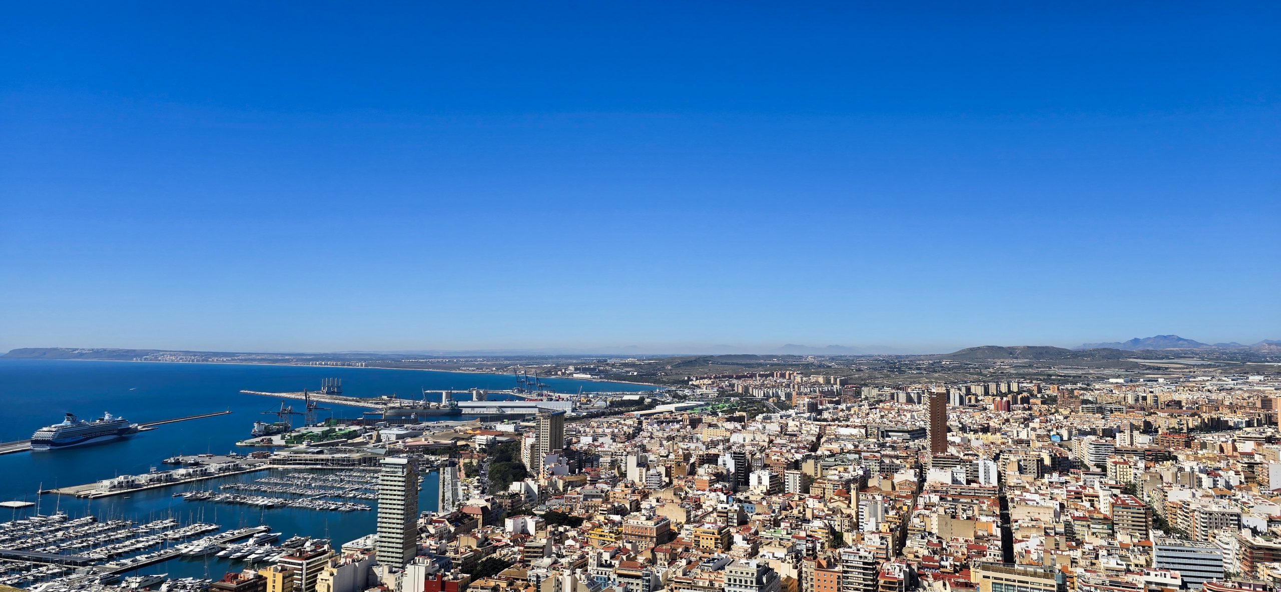 Warm golden light falling over Alicante’s waterfront, with the sea and city bathed in a soft evening glow.