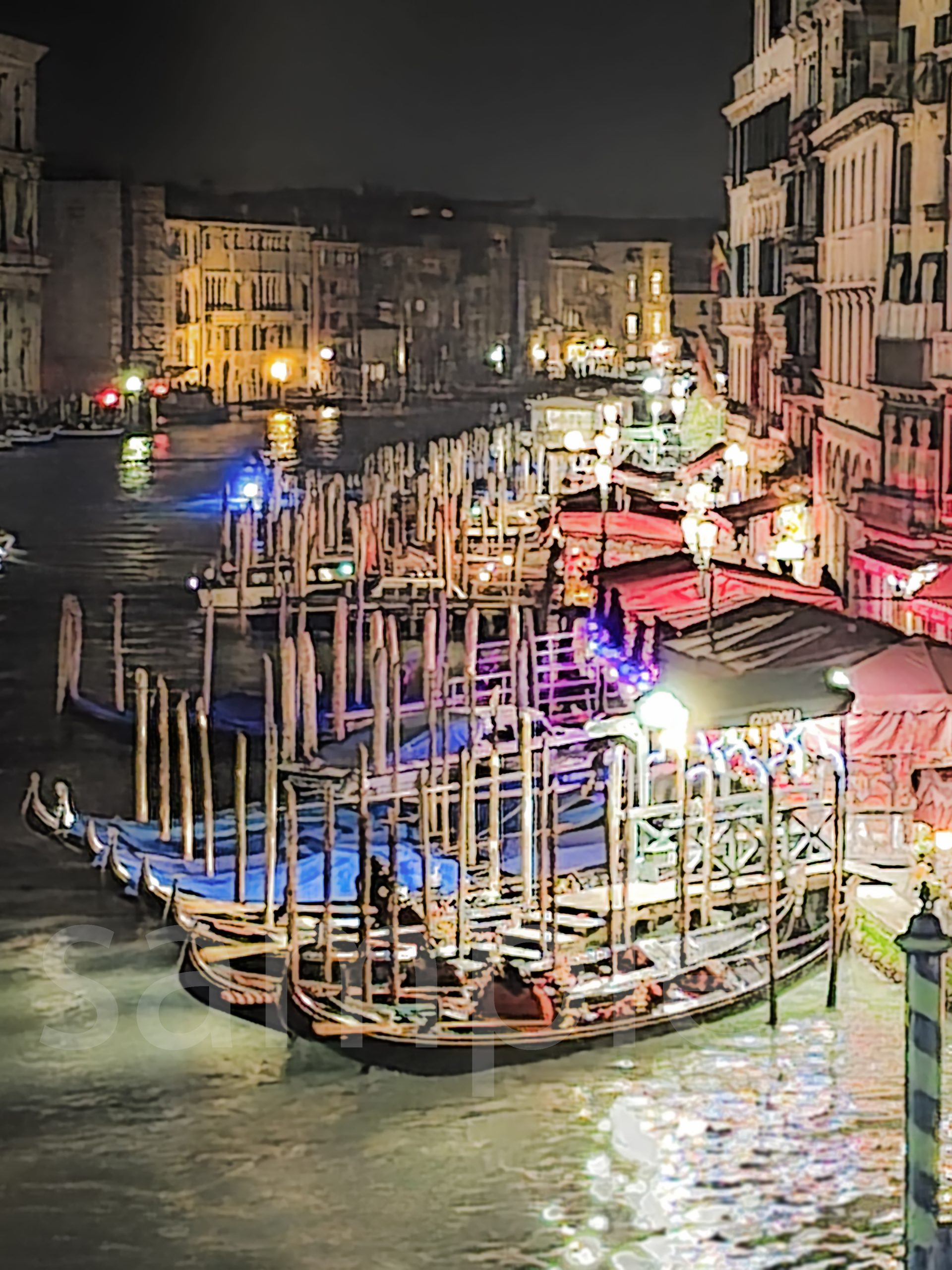 Night lights reflecting over gondolas on the Grand Canal.